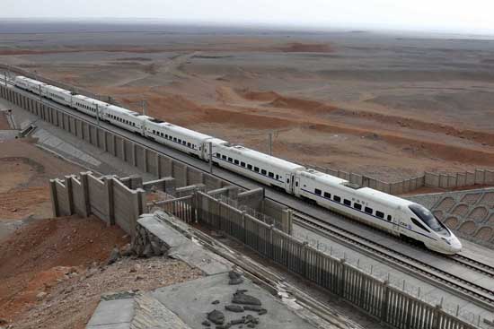 一列動車在新疆戈壁上疾馳(2014年12月18日攝)。新華社發(蔡增樂 攝)