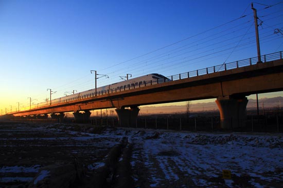 1月3日清晨,一列高鐵列車賓士在甘肅河西走廊張掖大地。新華社發(陳禮 攝)