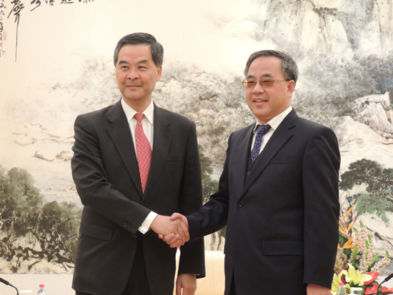 梁振英昨日到訪廣州,與胡春華會面,陪同的特區政府官員包括政制及內地事務局局長譚志源、教育局局長吳克儉和發展局局長陳茂波。