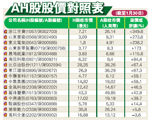 另外,今年市場憧憬「深港通」開車,目前17隻於港深兩地掛牌的A+H股,值得投資者留意。其中,折讓率較高的股份(即計及匯率因素后H股仍較A股平),包括汽車轉向系統制造商浙江世寶(1057)、石油設備股山東墨龍(568)及東北電氣(042)等,當中浙江世寶A股的溢價比率近350%,反映浙江世寶H股大為落后。