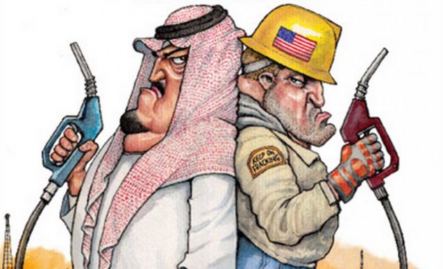 去年12月,英國《經濟學人》雜志就用以下封面圖片展示了沙特為首的OPEC產油國與美國頁巖油生產商的對峙。