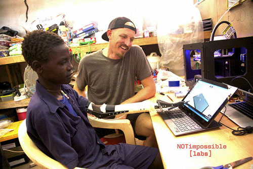 蘇丹男孩丹尼爾14歲就在戰亂中失去了他的雙手,而公益組織Not Impossible Labs的創始人米克-艾波林(Mick Ebeling)從《時代週刊》上讀到了丹尼爾的故事。他特地啟程前往蘇丹,以塑膠為列印材料,利用3D印表機為他製作了假手。這只成本僅為100美元的假手相比價值15000美元的傳統假肢而言便宜太多了。另外艾波林走時還將3D印表機留在了那裡,他教會當地人實用這項技術,造福那些需要幫助的人。
