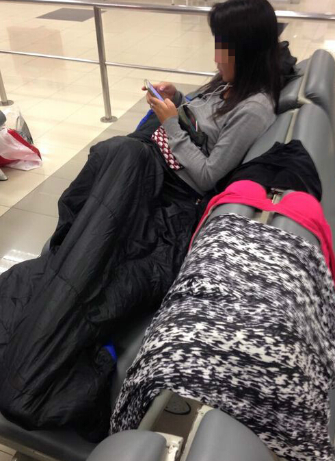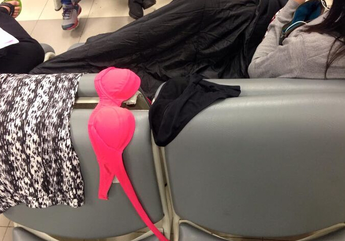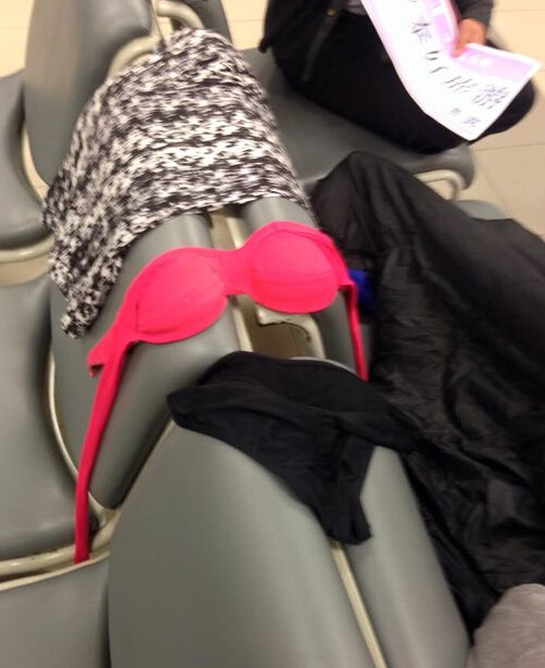 一位中国人模样、肤色比较黑的女子,坐在晾晒内衣的这排座椅上,若无其事地专心玩手机,有报道称她可能就是内衣的主人,相关电视画面显示,当时机场人流如潮。