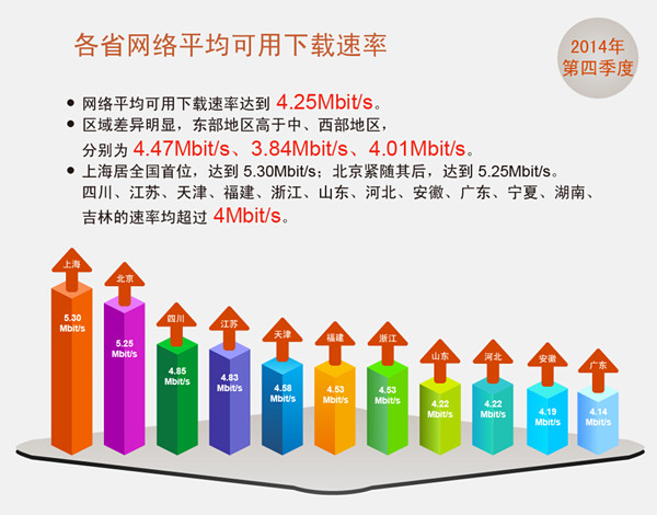 寬頻發展聯盟近期發佈了2014年第4季度《中國寬頻速率狀況報告》,資料顯示,自2013年8月國家實施 “寬頻中國”戰略以來,中國寬頻網速得到了明顯提升,這也充分體現了相關政府部門、基礎電信企業和互聯網企業等各方在推動中國寬頻發展方面所付出的努力。