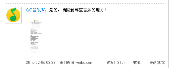 新浪科技訊 2月5日消息,今天淩晨2點,QQ音樂在新浪微博發佈一條置頂公告。標題為《是的,請回到尊重音樂的地方》。稱“我在捍衛正版的道路上不懈登攀,初心未改、虔誠不變;你卻在盜版的迷途上越走越遠,”並呼籲“回到尊重音樂的地方”。暗示“微信是因為盜版才封殺其他音樂軟體。”