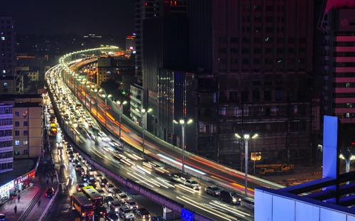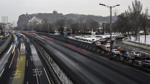 2月5日,車輛行駛在烏魯木齊市河灘快速路上。