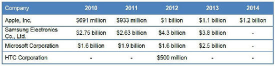 對於消費類電子產品,廣告是行銷的第一步。下表是蘋果、三星、微軟和HTC的年度廣告預算比較,資料來自各個公司的年報。