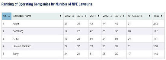 另一個潛在的威脅則是專利積累不足導致的專利訴訟。按照Patent Freedom的最新統計,蘋果在非執業實體(Non-practising entities,NPE)的專利爭端數量是大型IT、互聯網和高科技公司中間最多的。