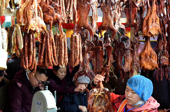 市民在年貨會上購買產自重慶的臘腸、風干鴨。
