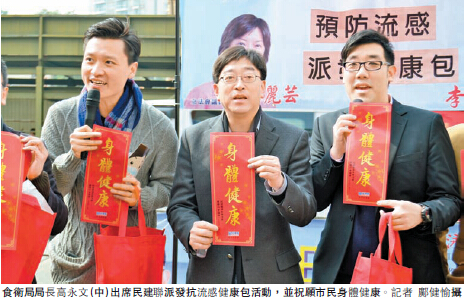 高永文其後出席民建聯於石硤尾向市民派發抗流感健康包活動時,稱今年流感接種比率較去年高,但整體接種率仍然偏低。自上月底開始感染流感的嚴重病例飆升,醫管局開始盡快安排高危人士接種疫苗,故醫管局及衛生署的疫苗數量由4萬劑跌至現時餘下1萬多劑疫苗,衛生署初步將增加約1萬劑疫苗。雖然現有的疫苗並非針對現正流行的甲型(H3N2)流感,但高永文引述專家建議,稱現有的疫苗依然「有好過無」。他續稱,學童如非必要亦不用戴口罩,以免感到不舒服。