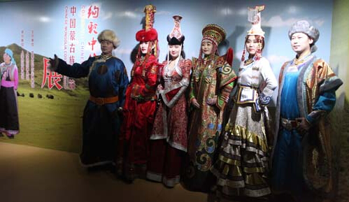 來自內蒙古科爾沁博物館的講解員正展示蒙古族服飾