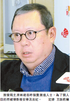 林建岳昨午出席旅發局記者會時狠批周日的屯門搗亂行動,形容小部分人為個人目的,破壞香港的安寧,影響香港的形象,不只令旅客受影響,本地市民都受影響,慨嘆事件破壞法紀。他續稱,旅遊業是香港主要收入來源,本港有20多萬人從事旅遊業,旅客需要保持增長,這不是個人問題,是香港整體問題;他促請當局認真研究本地接待遊客的能力。