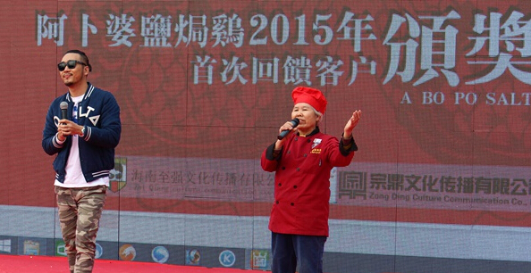 “阿婆支持我三年了,真的很感謝阿婆,我今天來到這個舞臺上,為阿卜婆鹽焗雞加油助陣,希望阿婆生意興隆,也希望大家在年貨展上買到自己喜歡的商品,祝愿大家新年快樂!”歌手強哥說。