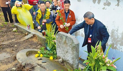 金门“古宁头战役”解放军遗族去年赴金门安岐村,在“万军营”前献花致敬。(图:台湾《旺报》资料照片)