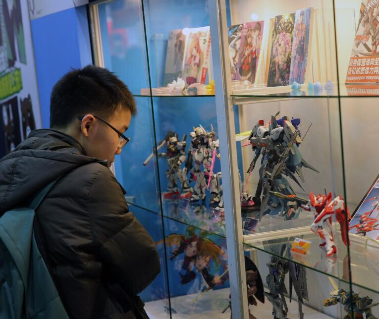 動漫粉絲被動漫周邊商品所吸引,駐足觀看。