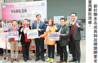 另外,新界社團聯會理事長陳勇議員、大埔區議員余智榮、沙田區議員李世榮、社區干事黃玉珍、梅少峰等20多名代表到政府總部請願,促請政府在農历年間,加強防疫措施,嚴防流感爆發,呼吁市民提高警覺,預防季節性流感,為預防流感在社區爆發,制訂完整的應對措施。