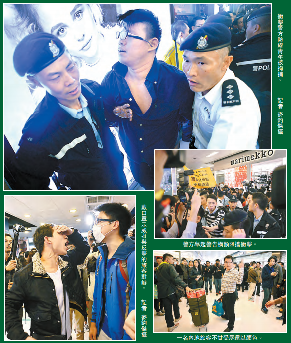 示威者在商場內多次與內地旅客對罵及發生沖突,場面混亂,在場警員需揮動警棍分隔在場人士。商場派出多名保安維持秩序,多條扶手電梯亦一度停頓,更以廣東話、普通話及英語廣播,表示商場內有民眾游行,呼吁在場人士不要驚慌,保持冷靜,注意安全。