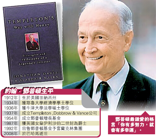 市面上談論投資大師約翰-鄧普頓的書籍眾多,《Templeton's Way with Money: Strategies and Philosophy of a Legendary In-vestor》(中譯本:《約翰鄧普頓的投資之道》)是其中較為專業的一本,主要展現了他的投資哲學和思想精髓。讀后不難發現,鄧普頓的成功和他勤奮冷靜的特質、挑選廉價股的眼光、以及對市場敏銳的洞察力密不可分。香港商報記者黃稀尔