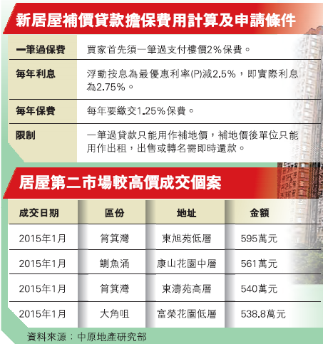 今次財政預算案中,在土地房屋政策方面,最值得一提的便是新居屋補價貸款擔保計劃。政府發言人指,該計劃很快便會推行,以增加供應,而透過參與新補價貸款擔保計劃的單位,已不屬於政府資助房屋,是私人物件,與政府政策無關。