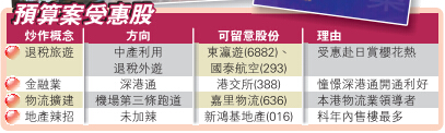 昨日公布的預算案加甜不加辣,基本合乎市場預期。當中內容給予短線炒賣貼士,甚至帶來長遠利好預期,投資者不能忽視。尤其旅游及地產股能夠循退稅、樓市不加辣等舉措受惠。本報挑選部分值得留意股份,就預算案如何利好作出分析及相應揣測,以供讀者部署參考。香港商報記者陳輝