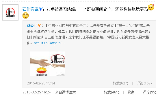 新浪財經訊 針對中國石油與中國石化的合併傳聞,中國石化[微博]新聞辦公室官方微博@石化實說25日下午評論稱:過年被逼問結婚,一上班被逼問合戶,還能愉快地玩耍嗎。