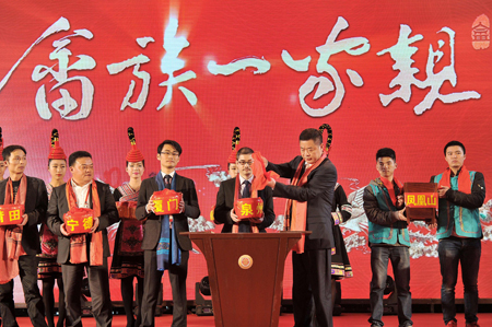 佘族同胞齐聚榕城 共商发展佘族经济。 2月24日晚,来自福建、广东、浙江等地的佘族同胞代表以及全国各地商会代表近500人,齐聚福州共商发展佘族经济,传承佘族文化等“佘族一家亲”活动。当天成立了福建省佘家企业商会和福建省佘家商会文化发展基金会,现场举行9地市佘族代表共同进行的佘山聚土仪式及多姿多彩的佘族非遗文化表演等。据悉,佘家企业商会正在计划在福州投资建一座福建省佘族经济文化交流中心,弘扬展示佘族文化交流平台。