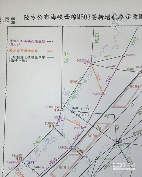 臺灣方面一直強調,大陸的M503新航線雖位在上海飛航情報區,但與臺北飛航情報區邊界僅有4.2海里,靠近所謂的“海峽中線”(圖片來自中時電子報)