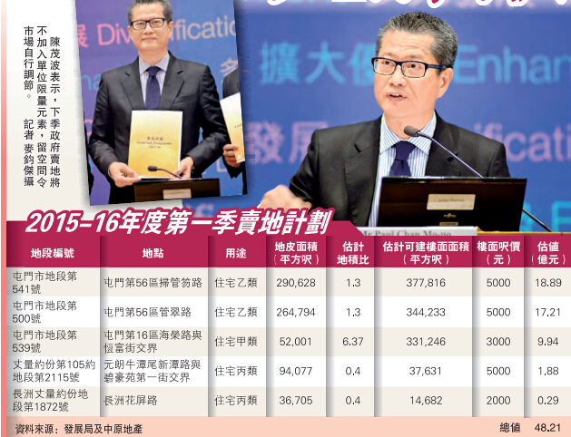 關於15至16年底私樓土地可供應總量的預測,陳茂波表示,政府賣地計劃可提供1.6萬個單位,連同港鐵西鐵元朗站項目可提供1880個、日出康城項目提供5350個、市區重建局亦提供840個,及私人重建及換地等項目提供的住宅單位,下年合共可提供約2.847萬個單位,而全年私樓土地供應目標是1.9萬個。
