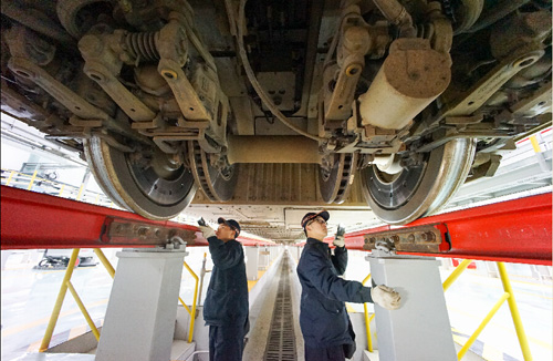 2月28日,鐵路迎來節后返程高峰,貴陽北動車運用所,一列列CRH2A動車駛進動車檢查庫內,等待“動車保健醫生”對它們進行體檢。貴陽北動車運用所主要負責“和諧號”動車組運用維修工作,運用所里100多名機械師基本上都是“80后”和今年剛入路的“90后”。由于“和諧號”白天上線運行,夜間進庫檢修,作業條件比較艱苦,正是這些“80、90”每天的精檢細修、辛勤付出,確保著“和諧號”動車組安全平穩運行,為貴廣高鐵首條高鐵的首個春運保駕護航。圖為一級修三、四號位車底作業。