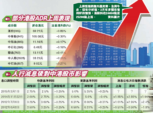 此外,第一上海首席策略師葉尚志表示,3月多個正面因素將利好港股,包括內地兩會的行情,以及歐央行正式落實每月600億歐元的量寬,料港股呈穩中偏好的格局,估計大市將在24650至25200點上落。
