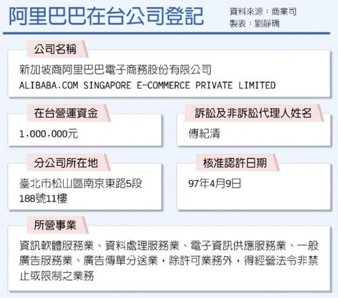 阿里巴巴臺灣分公司在臺灣監管部門的備案資料(圖片來自中時電子報)