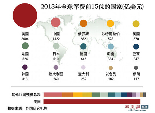 2013年全球軍費前15位的國家。(鳳凰軍事)