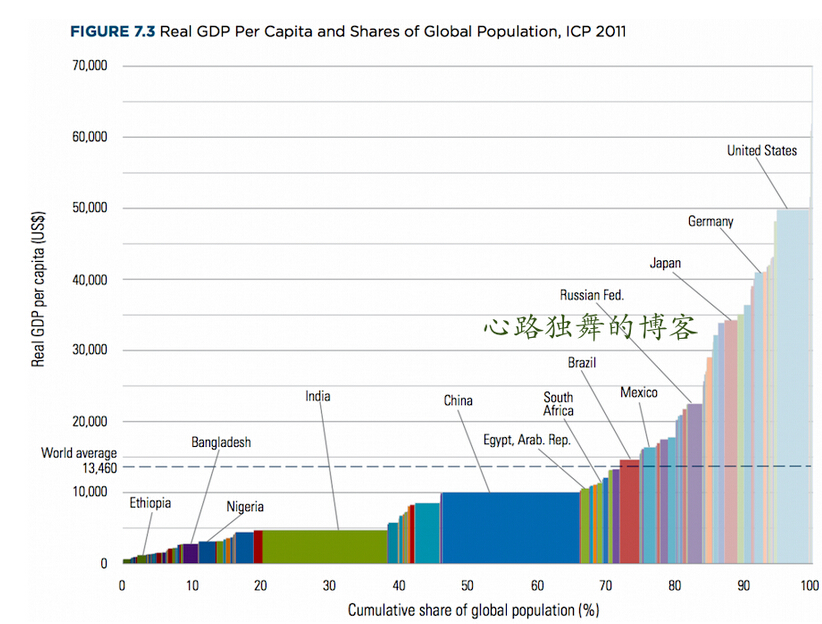 毋庸置疑,作為一個國家來說中國這些年的發展舉世矚目,但在世界范圍相對來看中國人還遠稱不上富有,其中一個最典型的標志是中國的人均GDP遠低于世界平均水平。下面是一張最近廣泛流傳的圖片,制做所使用的數據來自對世界財富數據收集并研究最詳盡的世界銀行國際比較項目(World Bank's International Comparison Program),橫坐標是國家人口,縱坐標是人均GDP。