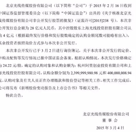 據悉,此次光線傳媒非公開發行股票的總金額為28億元人民幣,發行價格為24.22元/股,杭州阿里創業投資有限公司和光線傳媒控股股東上海光線投資控股有限公司將分別認購24億元和4億元。