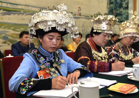 这是十二届全国人大三次会议贵州代表团的女代表王菁(前左)在参加审议。