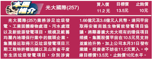 在兩會上,李克強總理除提及今年內地的經濟增長、通脹以及貨幣擴張速度等目標外,投資者亦注視政府工作報告中提及的行業發展,能否帶來新一輪投資機遇。政府工作報告對環保行業的發展着墨甚多,包括要大力發展風電、光伏發電、生物質能;積極發展水電,安全發展核電,開發利用頁岩氣、煤層氣,控制能源消費總量,加強工業、交通、建築等重點領域節能;發展循環經濟,大力推進工業廢物和生活垃圾資源化利用。