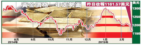 美國就業市場強勁令美元強勢,黃金價格明顯受壓,金價執筆時最低跌至1159美元,是自2014年11月底以來最低。黃金整體走勢轉弱,憧憬加息步伐加快,投資者拋售黃金,除非聯儲局又放出鴿派言論,金價反彈幅度不多,投資策略應在每次出現反彈時沽出黃金,黃金價格波幅區間下移至1150至1200美元,中位為1175美元。目前可令黃金反彈只有希臘的債務問題,本周歐元區財長會議是否批准延長對希臘的紓困計劃,惟避險情緒有機令黃金出現反彈,可考慮在中位以上沽出黃金,止蝕放在1202美元。資深市場人士文錦輝逢周三刊出