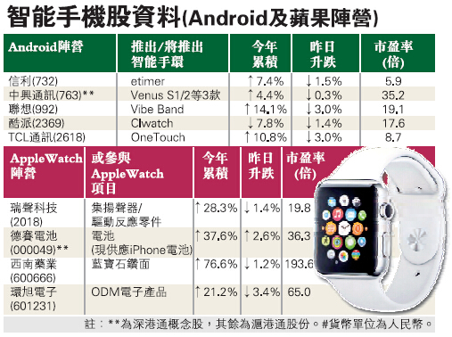 蘋果終於發布其首款智能手表AppleWatch,智能手表市場勢掀新一重波瀾。但專業評論對AppleWatch毀譽參半,Ap-pleWatch概念股昨日亦普遍走軟,AppleWatch炒作或許要稍等。同樣值得留意的是:其他安卓系統陣營的智能手表生產商,能否盡早占領市場領導地位,令該等股票有值得跟進的理由。香港商報記者 陳輝