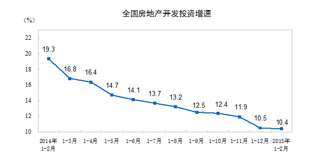 2015年1-2月份,全国房地产开发投资8786亿元,同比名义增长10.4%,增速比去年全年回落0.1个百分点。其中,住宅投资5922亿元,增长9.1%,回落0.1个百分点。住宅投资占房地产开发投资的比重为67.4%。