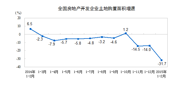 1-2月份,房地产开发企业土地购置面积2773万平方米,同比下降31.7%;土地成交价款699亿元,下降30.2%。