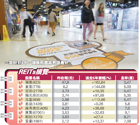 環球進入新一輪量寬,錢一多就不值錢了。有內地媒體計了條數,目前的200萬元不如30年前的一萬元,通脹猛如虎不是戲言。朋友圈里求抗通脹術一下子熱起來。關鍵:美國年內加息與否數一眾保值增值的渠道,房價過去5年升值大約1.4倍,如今收緊按揭成數,上車難上加難;金價風光一時,5年一過又打回原形;iBond美其名曰與通脹挂恥,若剛非上市時買入,可以說是没肉食;REITs最給力,以領匯(823)為例,5年股價累升1.6倍,每年平均還有3.5厘的息收。僅息率回報幾乎能與通脹看齊。