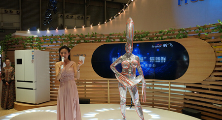 这是某厂商家博会展台活动的现场,左边这位女主持娇艳动人,右边这位“不明生物”亭亭玉立,可谓最“乱入”的同台。
