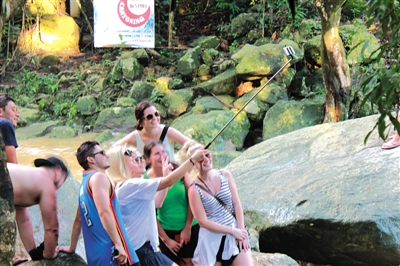 當地時間2014年12月3日,泰國蘇梅島,外國遊客在景區用自拍杆合影。