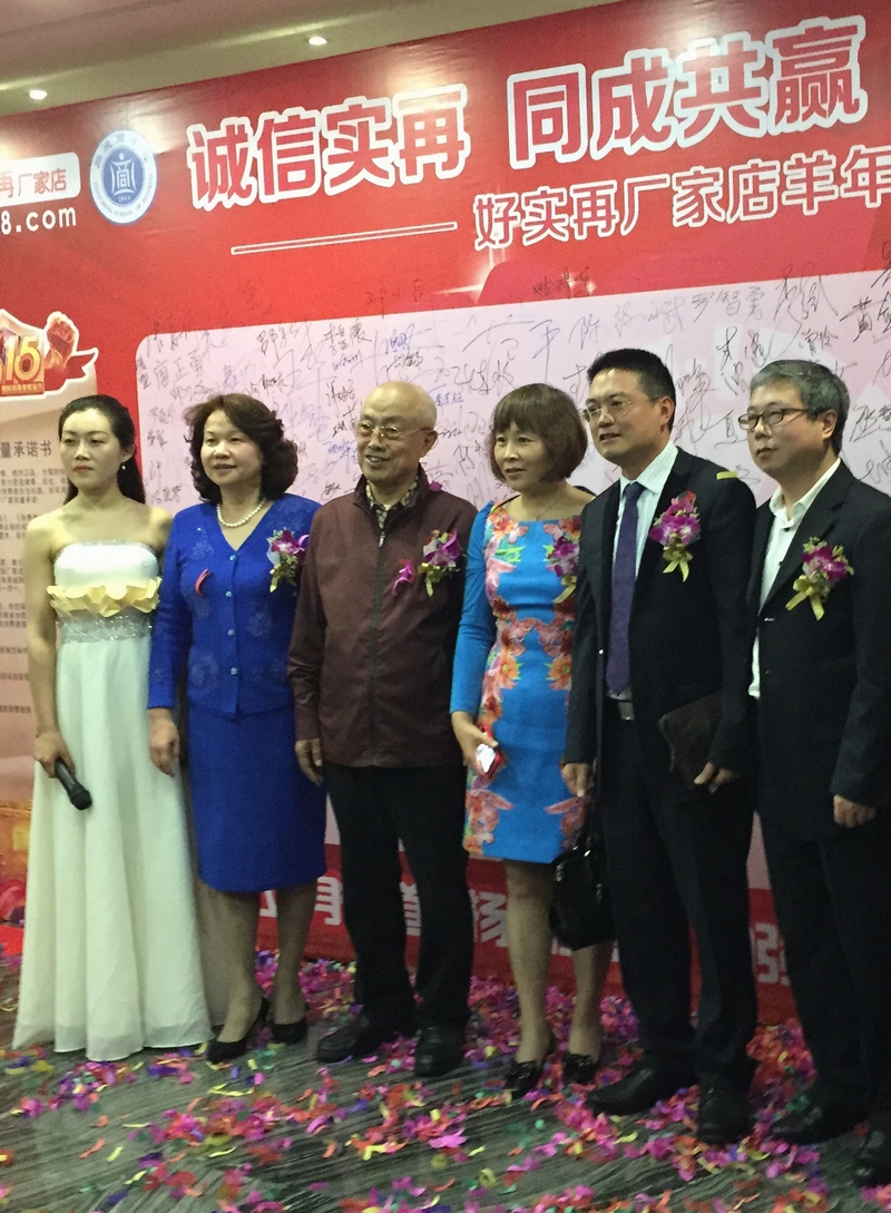 深圳市电子商会创会会长王殿甫(左三)、深圳市国际投融资商会副会长沈军瑛(左二)、深圳市商业联合会常务秘书长范颖(右一)与好实再董事长张天文博士(右二)共同出席好实再3.15千人大会。