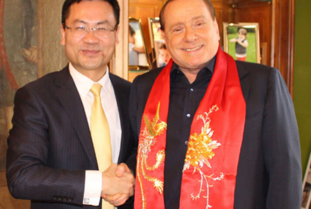 贝卢斯科尼总理戴着汉绣与刘萌执行会长合影