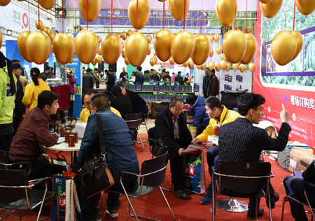 3月16日,参展商与购买商在内蒙古国际会展中心一展位洽谈合作事宜。