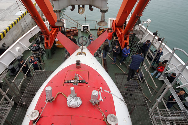 3月17日,人們在位於山東青島的國家深海基地參觀“蛟龍”號載人潛水器。