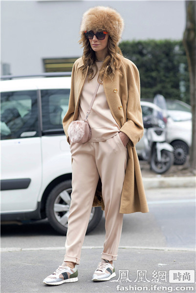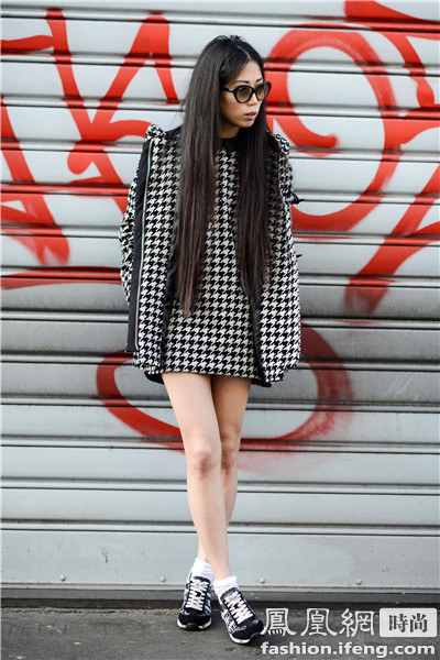 俄罗斯版《Glamour》杂志高级时装编辑兼造型师Oksana On千鸟格纹套装搭配同色系的运动鞋