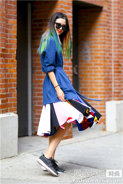 韩国模特Irene Kim 绿色的裙装搭配花色运动鞋