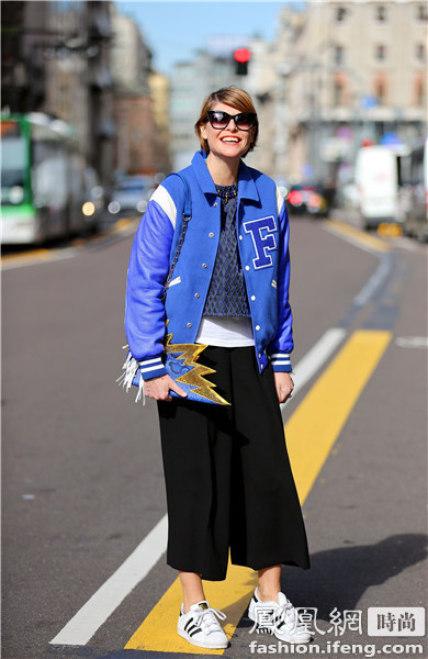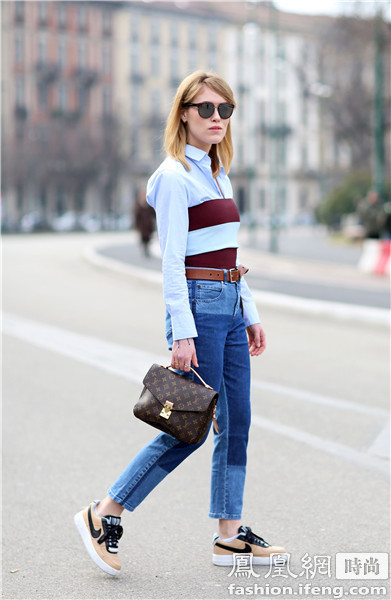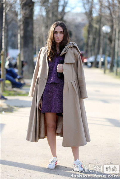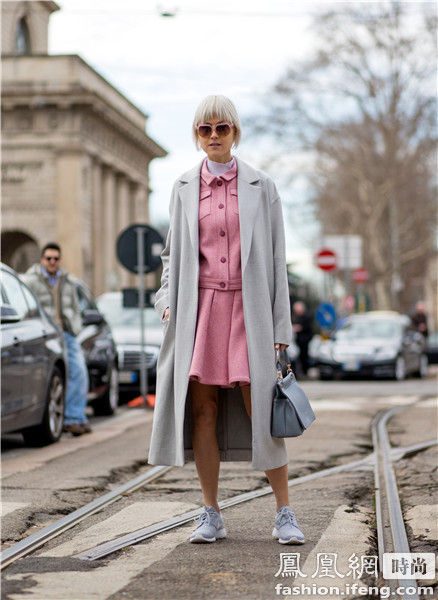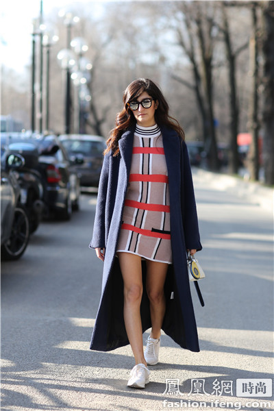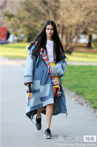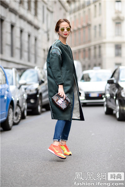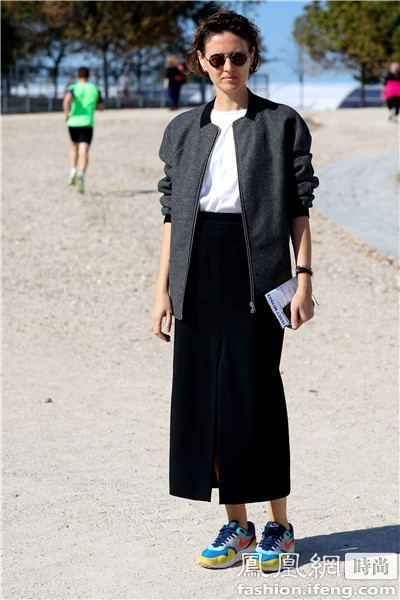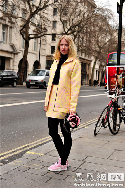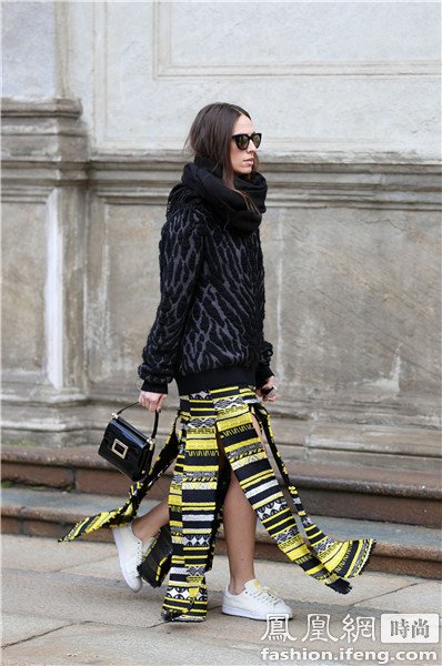 时尚博主blogger Helena Bordon 的造型上半身比较沉默所以选择了黄色的运动鞋来搭配